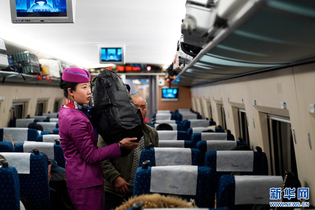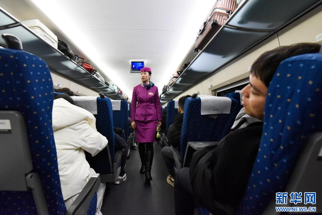 2时整,G4923次列车准时发车,乘务员开始巡视车厢。新华网发(沈向全 摄)