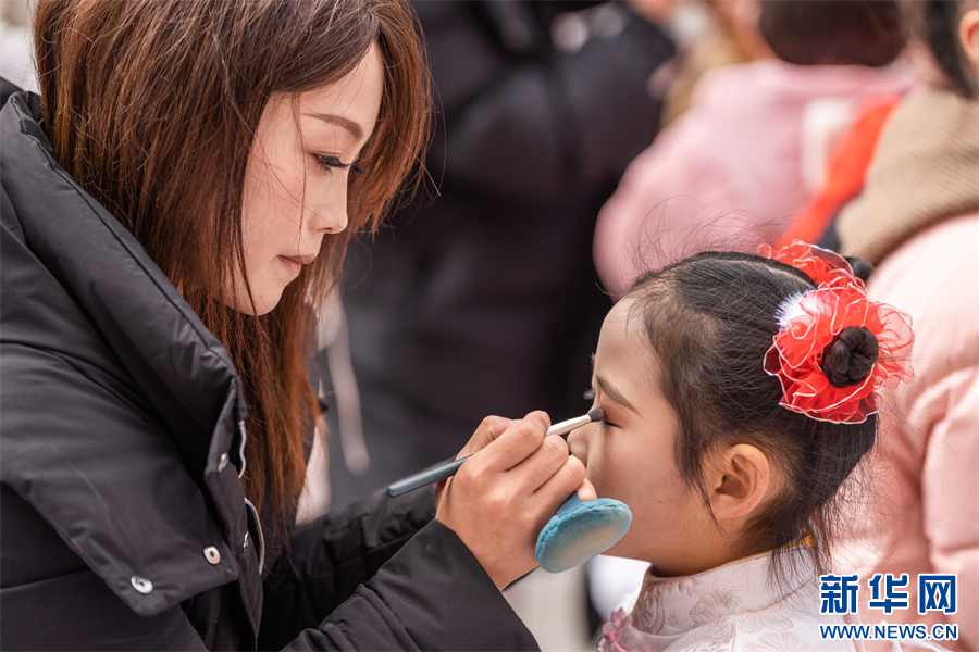 村民在贵州省毕节市百里杜鹃管理区鹏程街道坪子社区群众给即将上台表演的小朋友化妆(2月4日摄)。新华网发(罗大富 摄)
