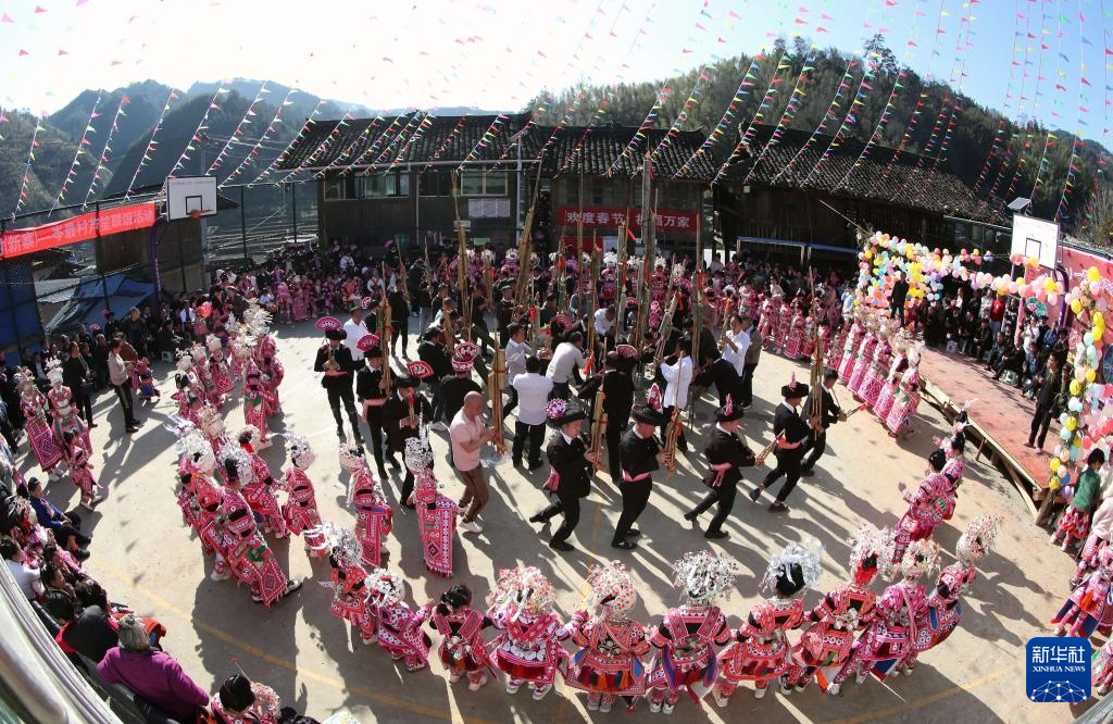 2月11日,在贵州省榕江县朗洞镇定向村,苗族群众吹芦笙、跳芦笙舞。