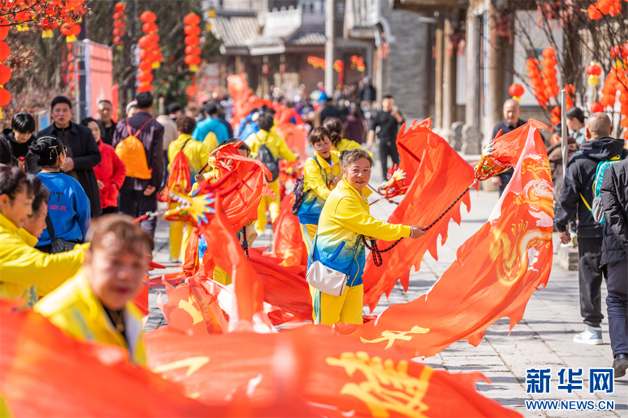 2月11日,市民在贵州省毕节市同心步行街上为游客表演舞彩龙。新华网发(罗大富 摄)
