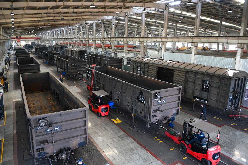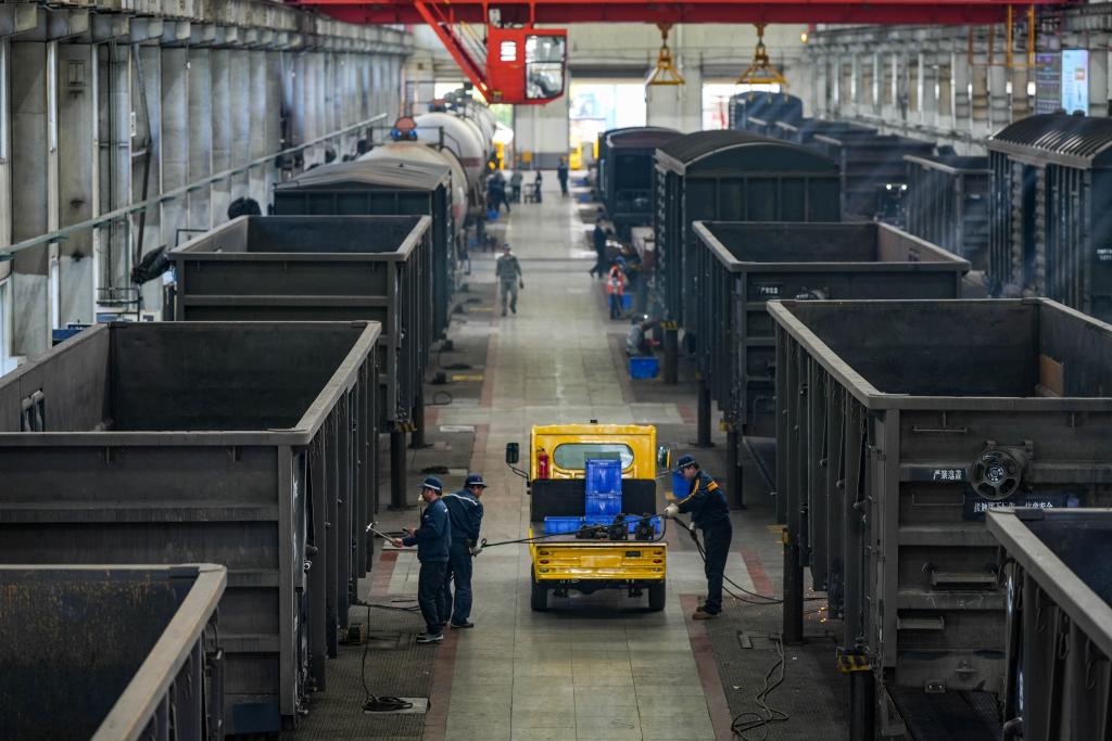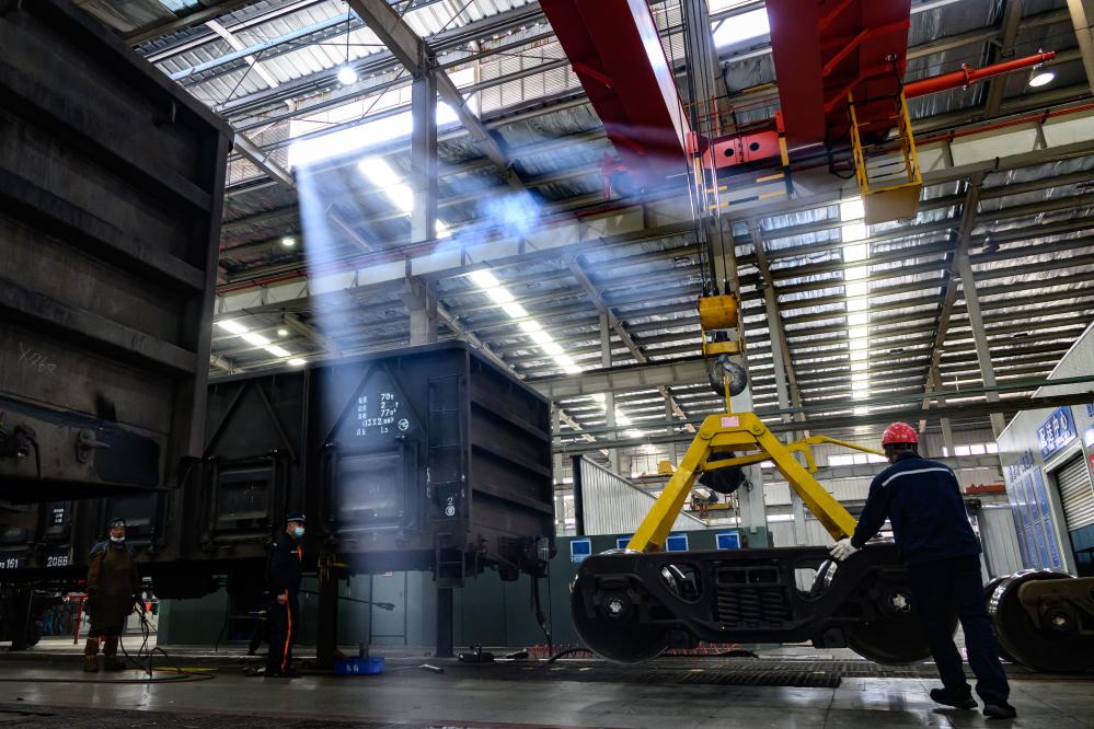 2月18日,在贵阳南车辆段检修车间,工作人员对货运列车车体进行检修。