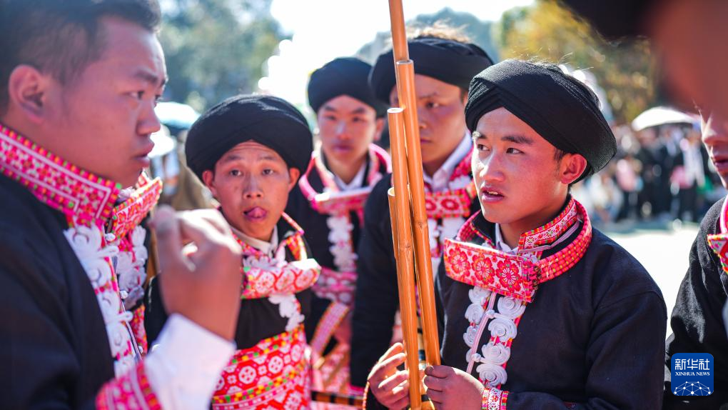 2月19日,苗族群众在六枝特区梭戛苗族彝族回族乡高兴村跳花场吹奏芦笙。新华社记者 陶亮 摄