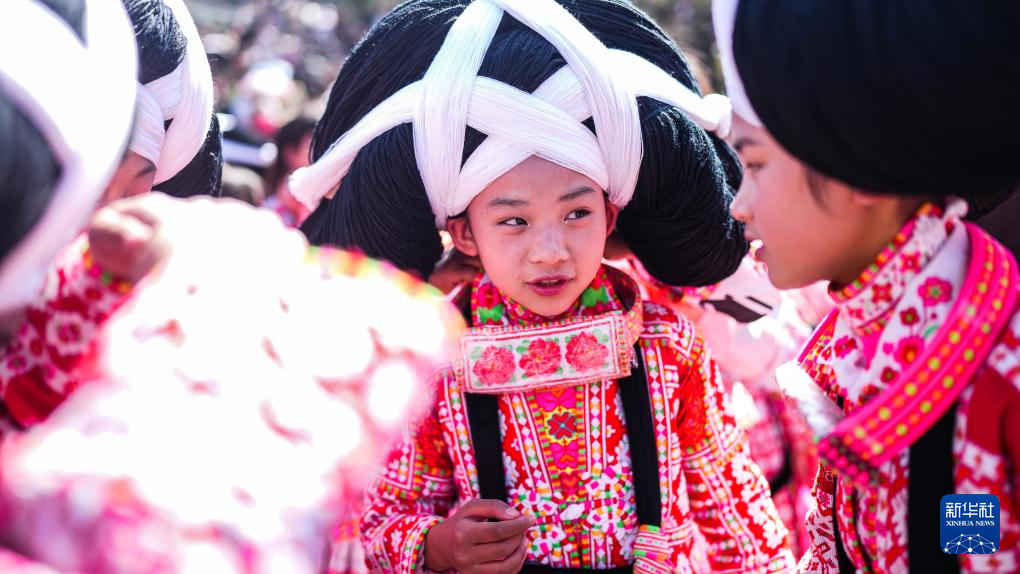 2月19日,小朋友在六枝特区梭戛苗族彝族回族乡高兴村跳花场聊天。新华社记者 陶亮 摄