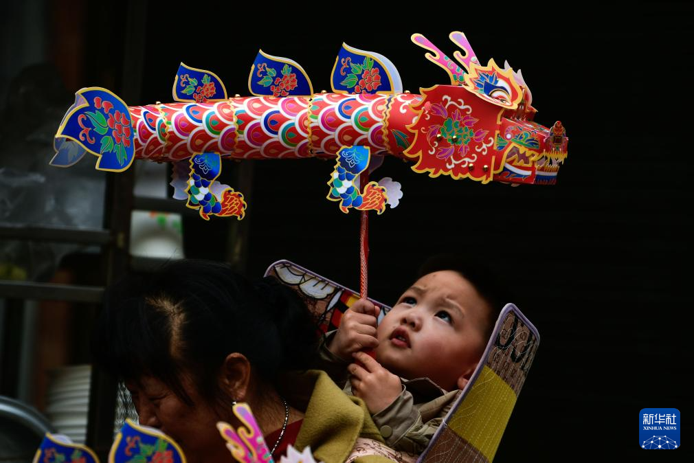 2月20日,一名小朋友在贵州省石阡县仡佬毛龙节毛龙巡游活动中举起纸龙。