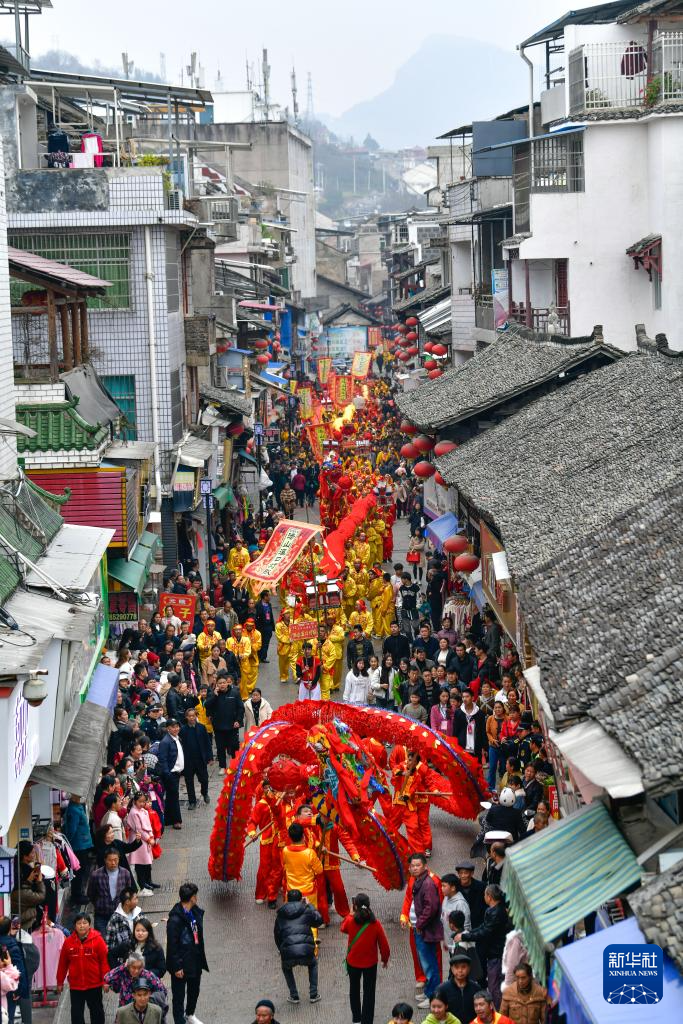 2月20日,人们在贵州省石阡县仡佬毛龙节上参加毛龙巡游。
