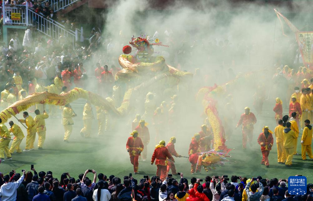 2月20日,人们在观看贵州省石阡县仡佬毛龙节舞龙大赛。