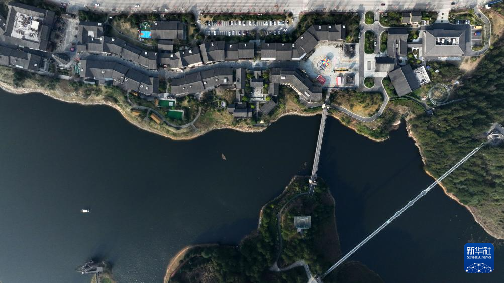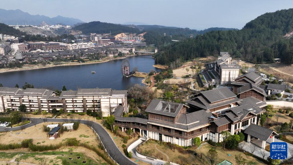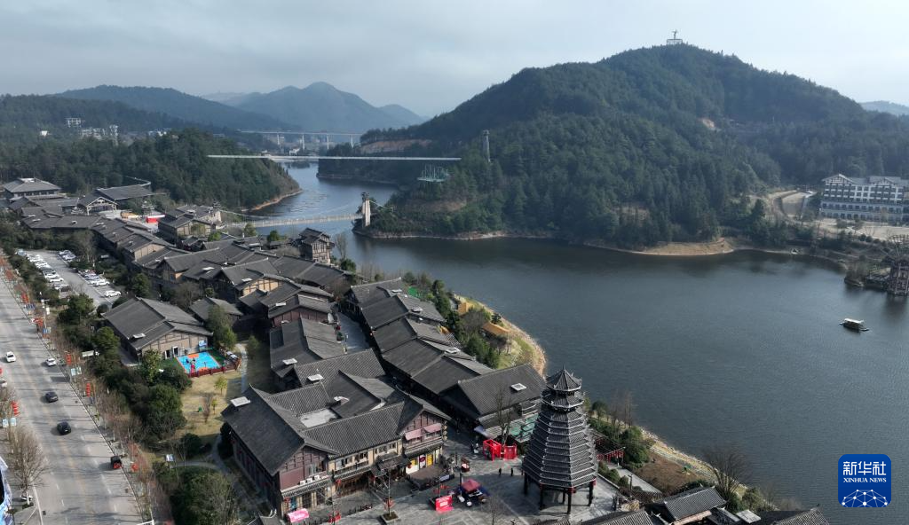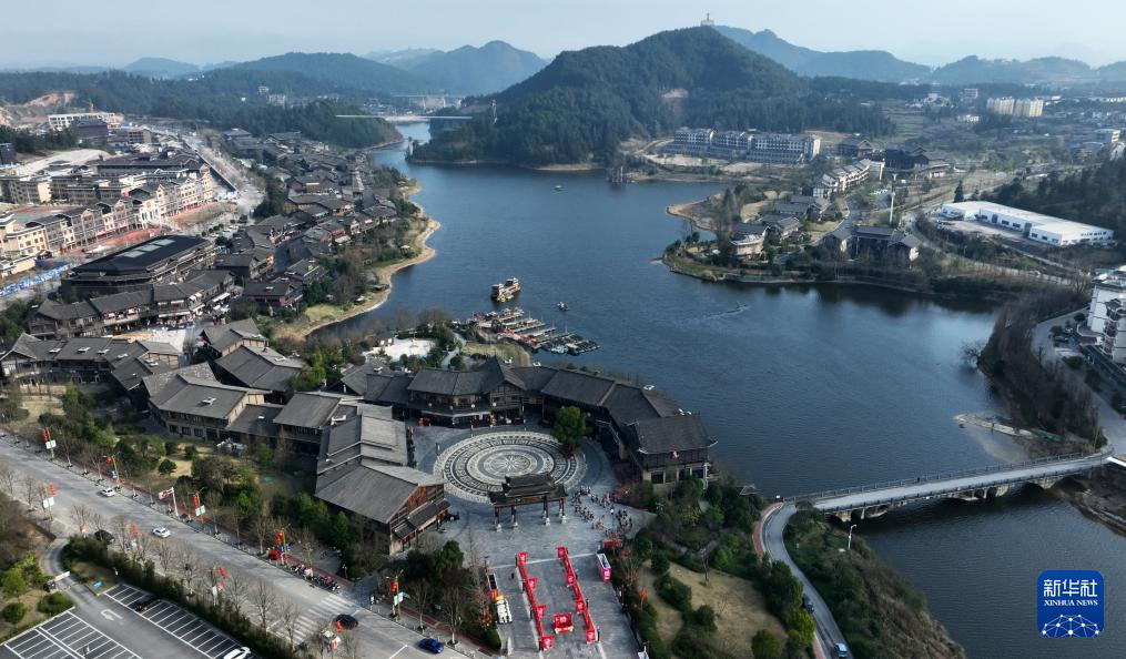 2月21日拍摄的贵州省黔东南苗族侗族自治州丹寨县万达小镇景区春景(无人机照片)。新华社记者 杨楹 摄