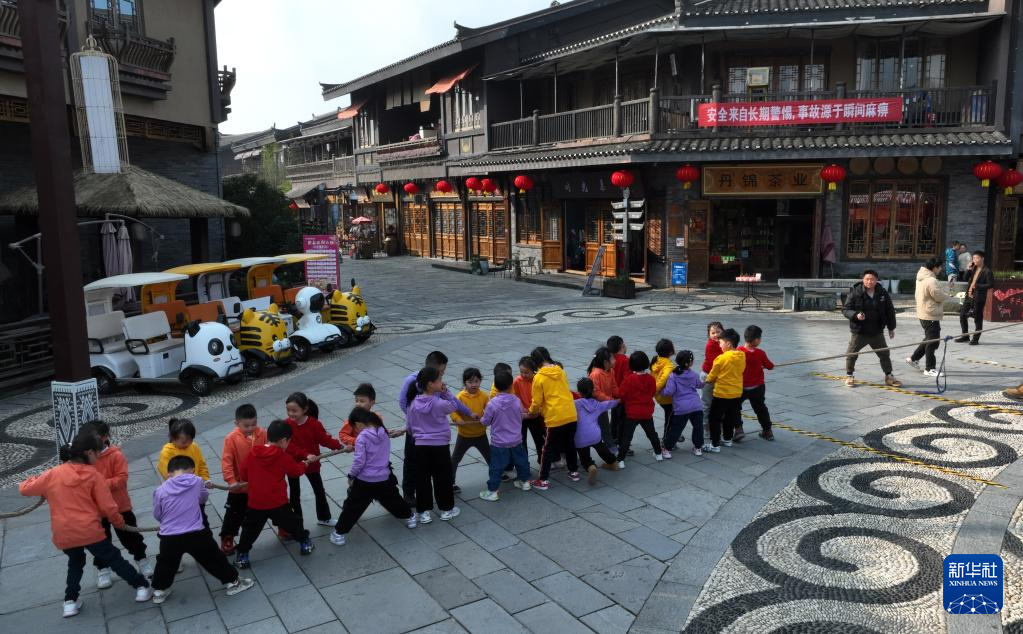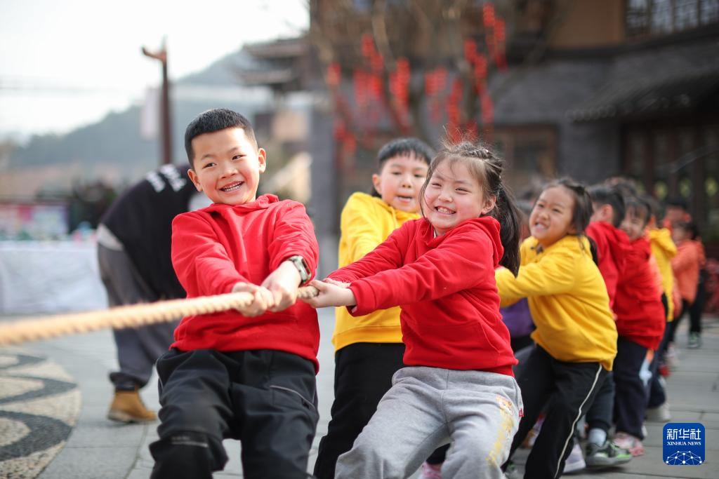 2月21日,小朋友在贵州省黔东南苗族侗族自治州丹寨县万达小镇景区参加拔河比赛。新华社发(杨武魁 摄)