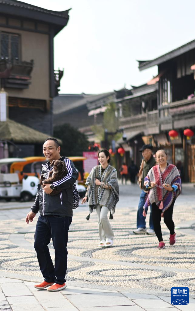 2月21日,游客在贵州省黔东南苗族侗族自治州丹寨县万达小镇景区游玩。新华社发(杨胜贤 摄)