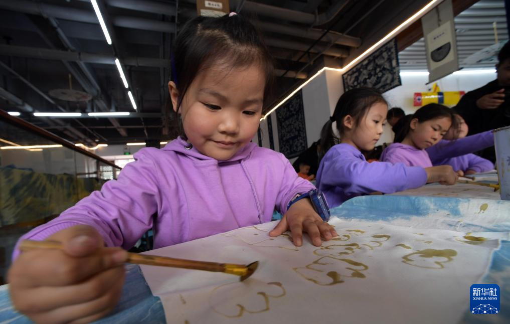 2月21日,小朋友在贵州省黔东南苗族侗族自治州丹寨县万达小镇景区体验苗族蜡染。新华社记者 杨楹 摄