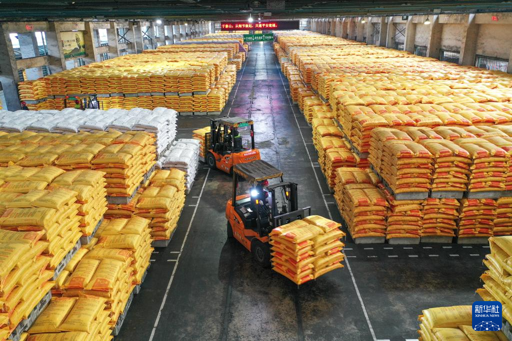 3月1日,工人驾驶叉车在贵州磷化集团黔南州生产基地搬运化肥(无人机照片)。新华社记者 杨文斌 摄