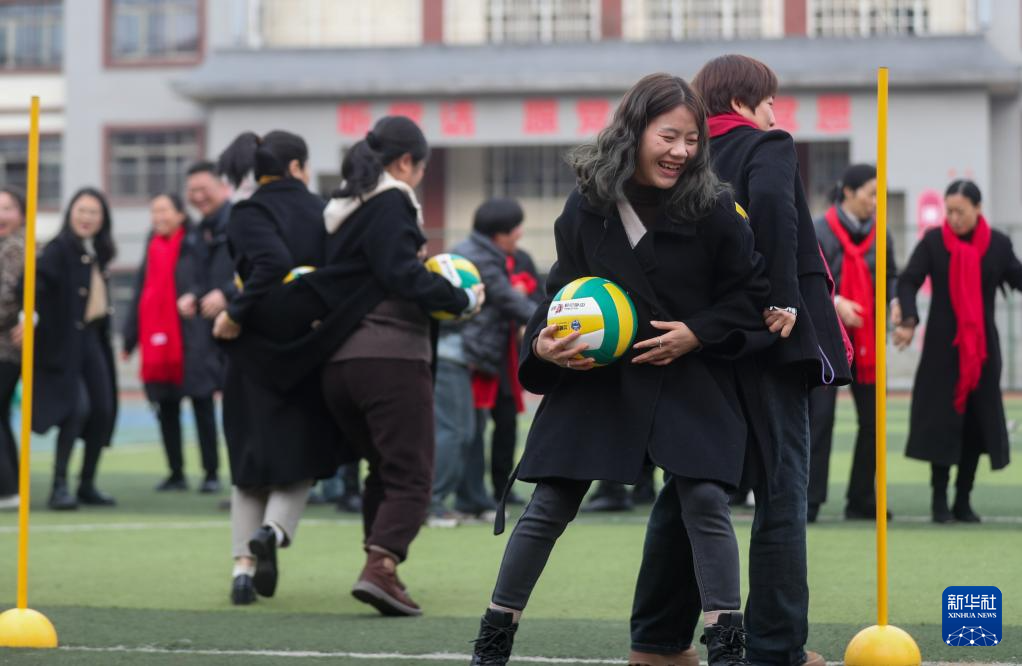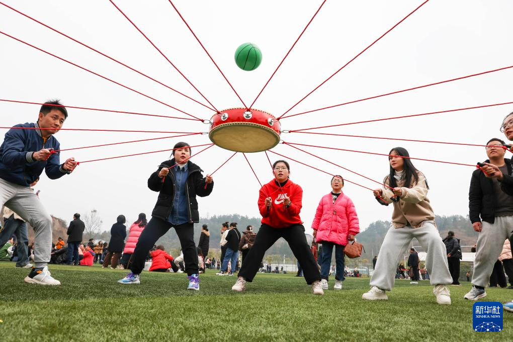 3月7日,人们在贵州省黔东南苗族侗族自治州岑巩县体育馆参加趣味游戏。新华社发(罗慧 摄)