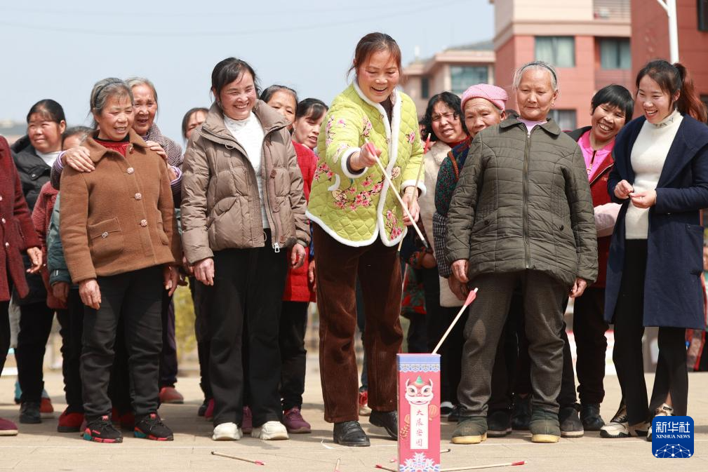 3月7日,在贵州省黔东南苗族侗族自治州岑巩县㵲水街道大榕凉塘社区,妇女们在迎“三八”活动中参与趣味投壶。新华社发(唐鹏 摄)
