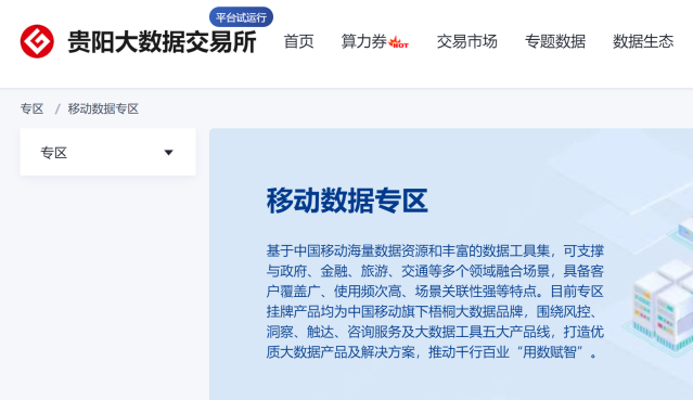 3月8日,由贵阳大数据交易所与中国移动大数据(贵阳)创新研究院联合运营的全国首个“移动数据专区”正式上线。