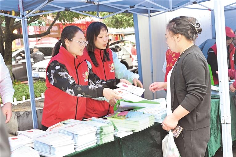 公职律师曾明秀(左一)为群众发放法律宣传册。(贵州省应急管理厅供图)