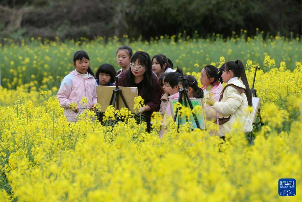 3月17日,人们在贵州省开阳县米坪乡油菜花田里写生。新华社发(袁福洪摄)