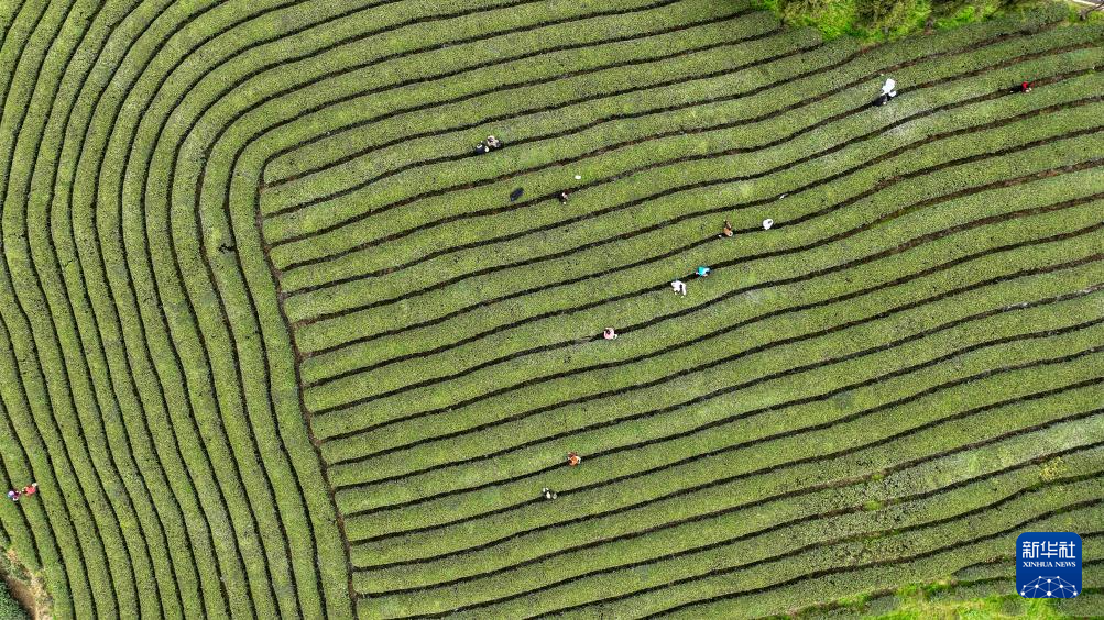 3月16日,人们在贵州省遵义市凤冈县的生态茶园里采摘春茶(无人机照片)。