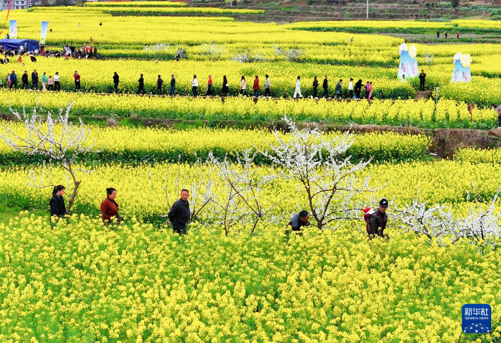 3月17日,人们在贵州省黔东南苗族侗族自治州黄平县旧州镇白纸桥村赏花游玩(无人机照片)。新华社发(张平摄)