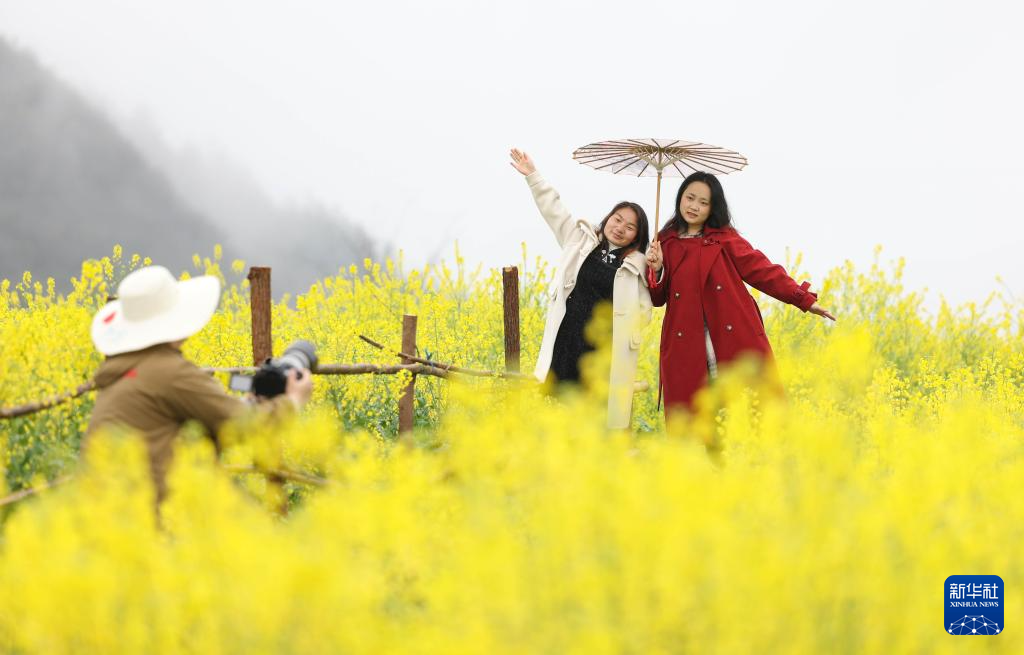 3月17日,游客在贵州省铜仁市玉屏侗族自治县朱家场镇混寨村油菜花田拍照。新华社发(胡攀学摄)