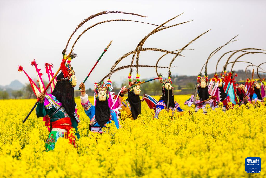 3月17日,地戏艺人在贵州省安顺市西秀区大西桥镇狗场屯村油菜花田为前来赏春的游客表演地戏。新华社发(陈熙摄)