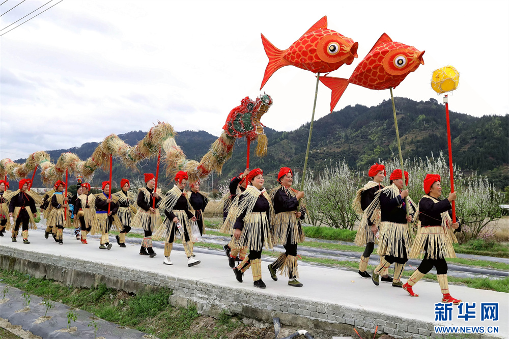 3月18日,在贵州省黔东南苗族侗族自治州榕江县三宝侗寨,侗族妇女身着稻草衣,手舞稻草龙欢庆“萨玛节”。新华网发(李长华 摄)
