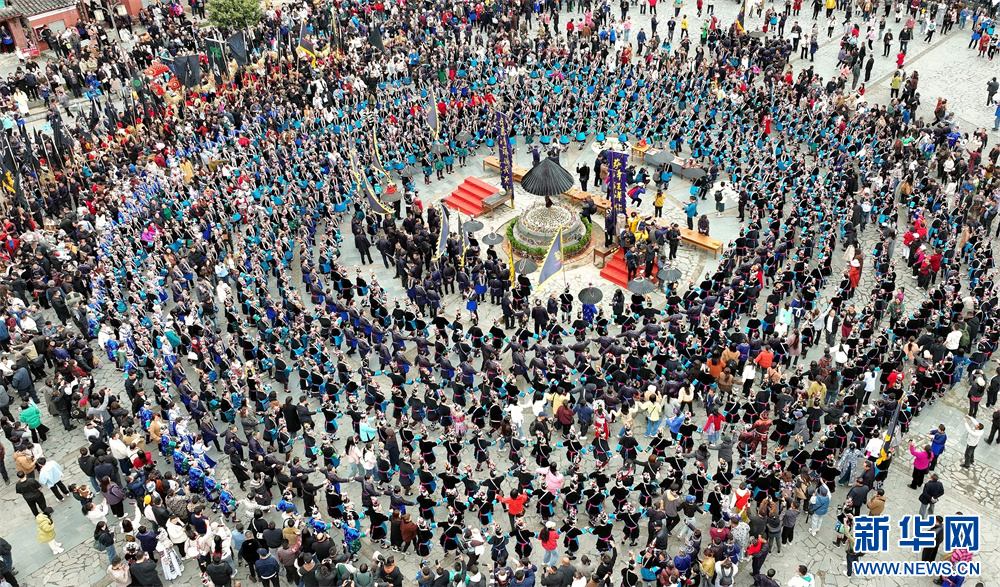 3月18日,在贵州省黔东南苗族侗族自治州榕江县三宝侗寨,侗族同胞在跳多耶舞欢庆“萨玛节”(无人机照片)。