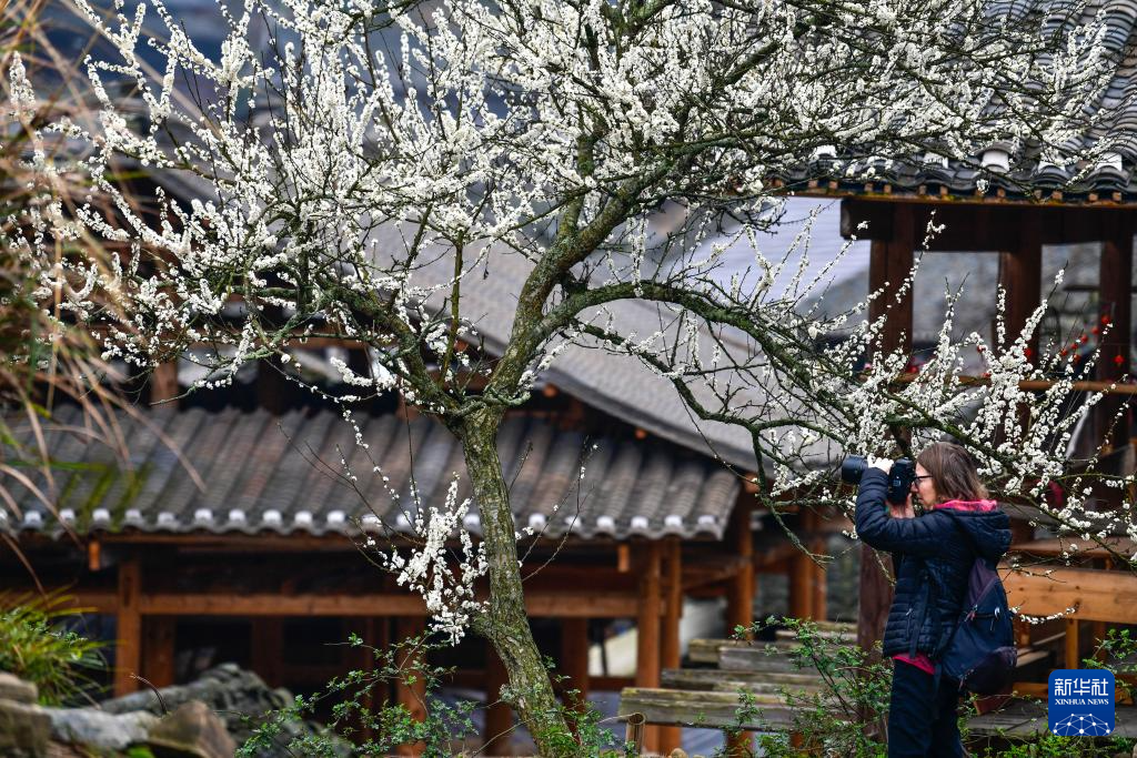 3月18日,一名外籍游客在贵州省榕江县栽麻镇大利侗寨拍照。新华社记者 杨文斌 摄
