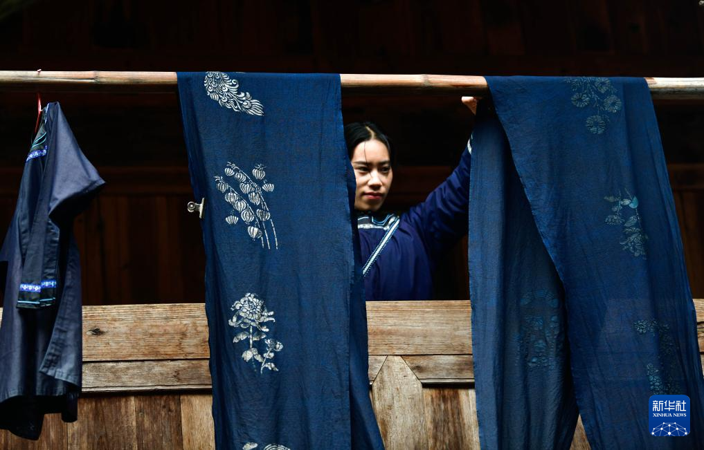 3月18日,贵州省榕江县栽麻镇大利侗寨的村民在晾晒侗布。新华社记者 杨文斌 摄