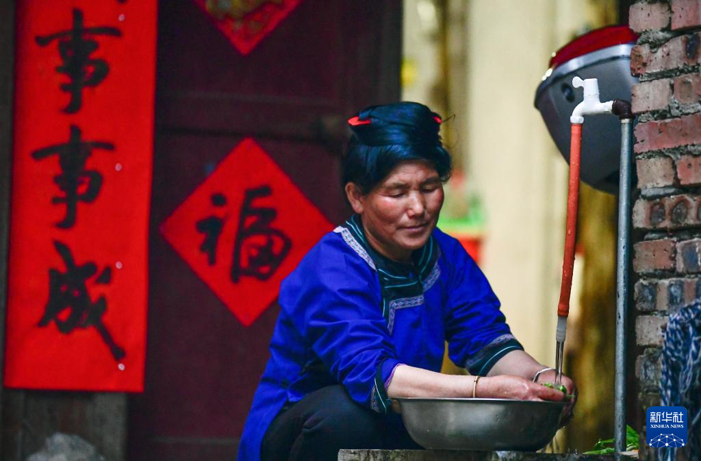 3月17日,贵州省榕江县栽麻镇大利侗寨的村民使用自来水洗菜。新华社记者 杨文斌 摄