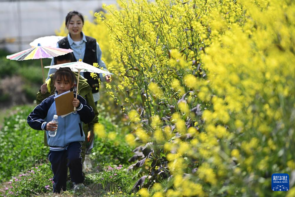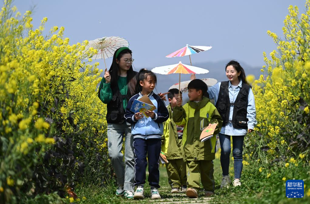3月21日,教师带领学生在绥阳县盛林生态农场踏青。新华社记者 杨楹 摄
