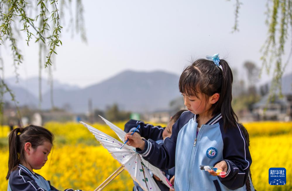 3月21日,学生在绥阳县盛林生态农场制作手工作品。新华社发(李珊珊摄)