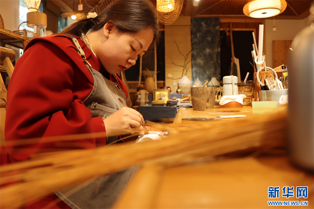 3月20日,在贵州省赤水市大同镇极竹堂非遗竹编产学研基地,工人在编制立体竹编。新华网发(张浪摄)