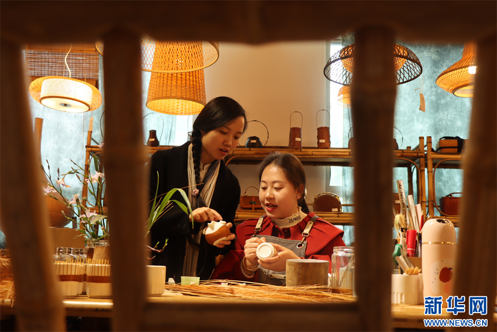 3月20日,在贵州省赤水市大同镇极竹堂非遗竹编产学研基地,杨昌芹指导工人编制立体竹编产品。新华网发(张浪摄)