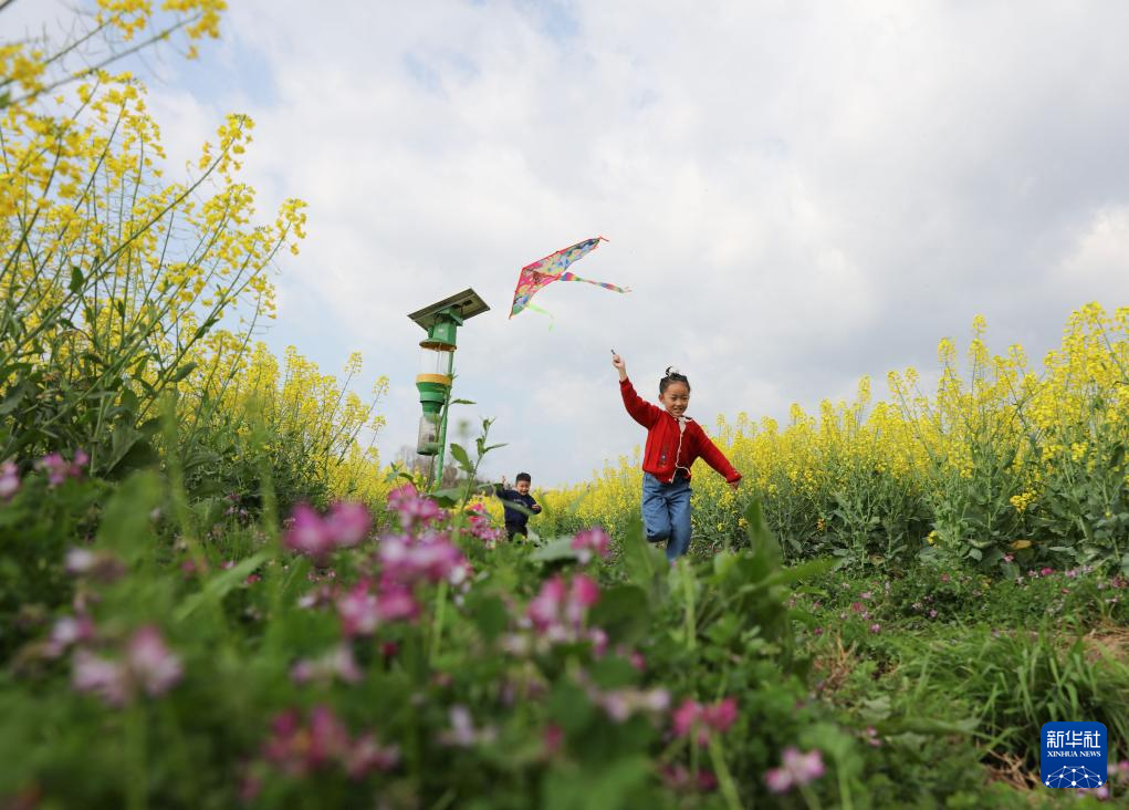 3月23日,小朋友在贵州省黔东南苗族侗族自治州施秉县城关镇上翁哨村油菜花田中放风筝。新华社发(磨桂宾摄)