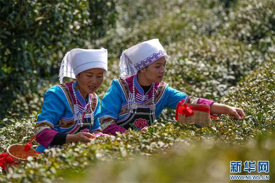 3月24日,茶农在贵州省都匀市毛尖镇坪阳村茶园采摘春茶。新华网发(龙建睿 摄)