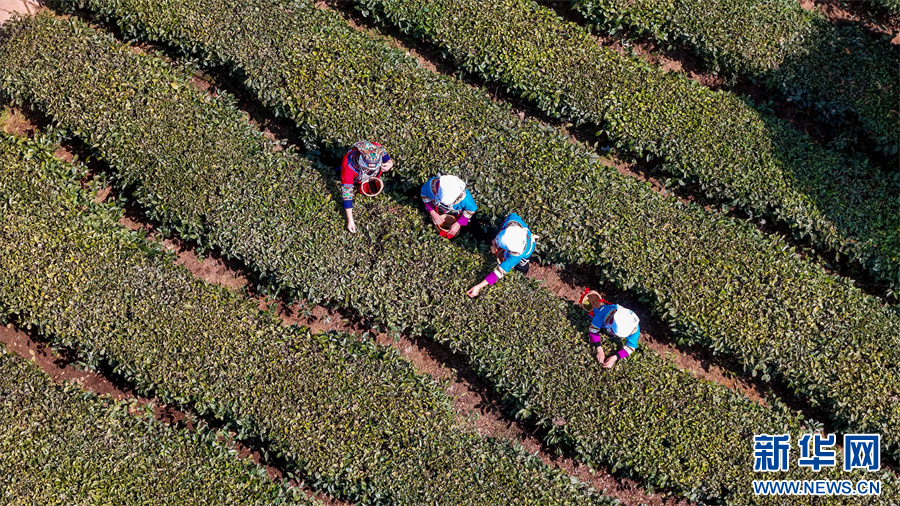 3月24日,茶农在贵州省都匀市毛尖镇坪阳村茶园采摘春茶(无人机照片)。新华网发(龙建睿 摄)