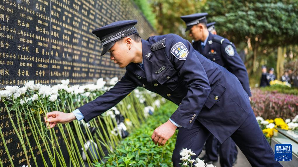 4月3日,在贵州公安英烈纪念墙前,民警代表向公安英烈敬献鲜花。新华社记者 陶亮 摄