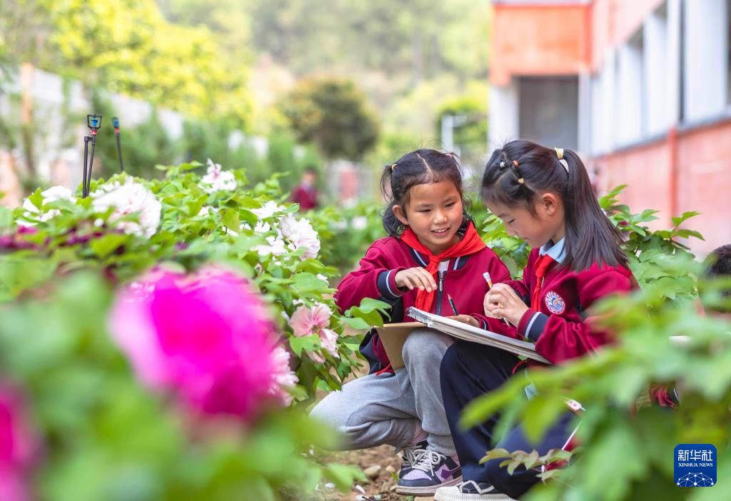 4月3日,学生在贵州省黔西市惠风学校劳动教育实践基地牡丹园练习绘画。