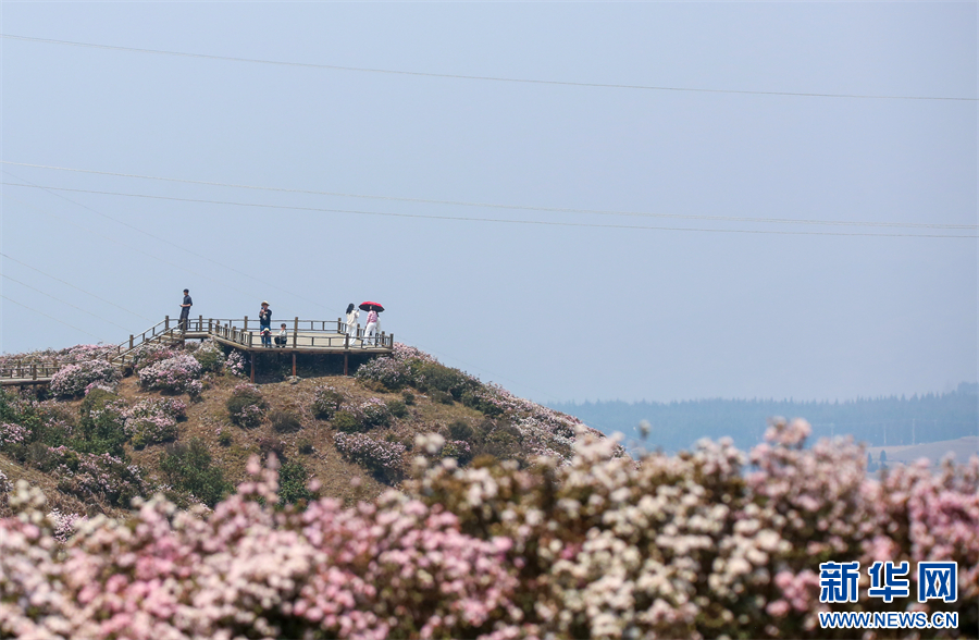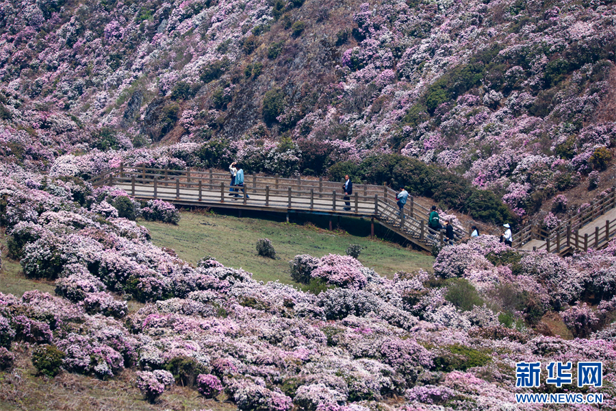 4月5日,游客在乌蒙大草原观赏盛开的高原矮杜鹃。新华网发(赵桦 摄)