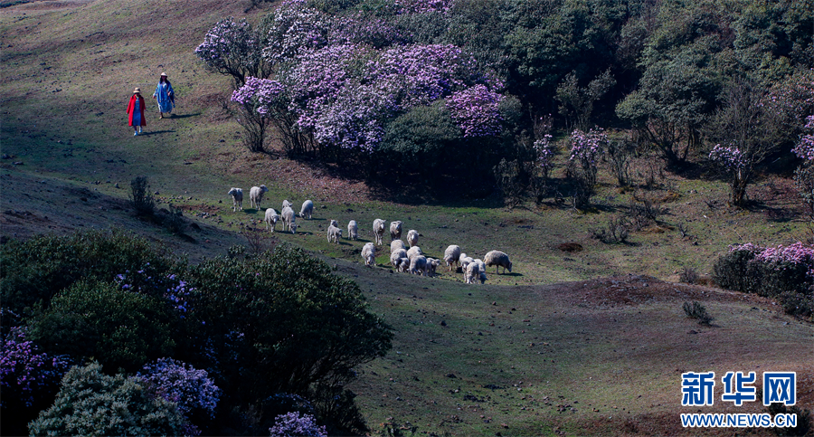 4月5日,游客和羊群游走在盛开的高原矮杜鹃花之间。新华网发(赵桦 摄)