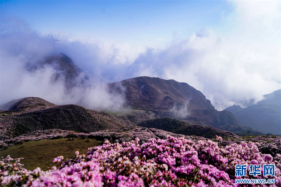 近日,贵州省六盘水盘州市乌蒙大草原内的万亩野生高原矮杜鹃绚丽绽放,并形成了花海云海相互交融的奇特景观。时值清明节,众多游客慕名前往赏花踏青。