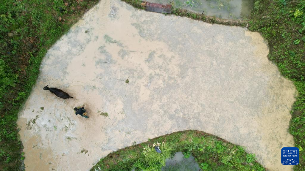 4月20日,村民在贵州省黔东南苗族侗族自治州从江县庆云镇赶着耕牛耕田(无人机照片)。新华社发(陈灵摄)
