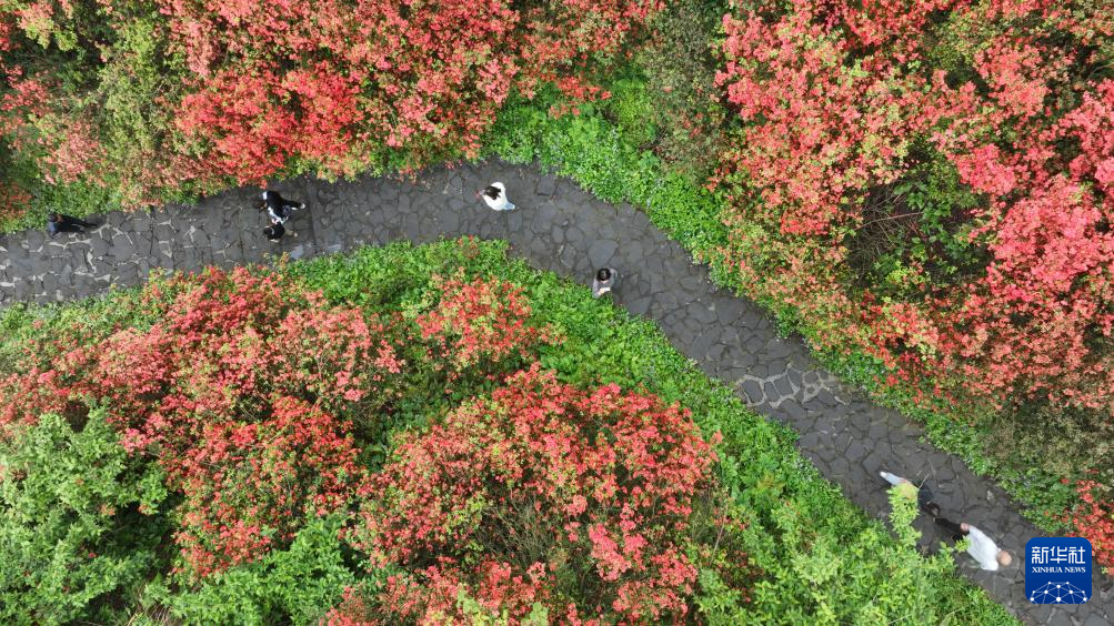4月20日,游客在贵州省丹寨县龙泉山杜鹃花丛中游玩(无人机照片)。新华社发(杨露婷摄)