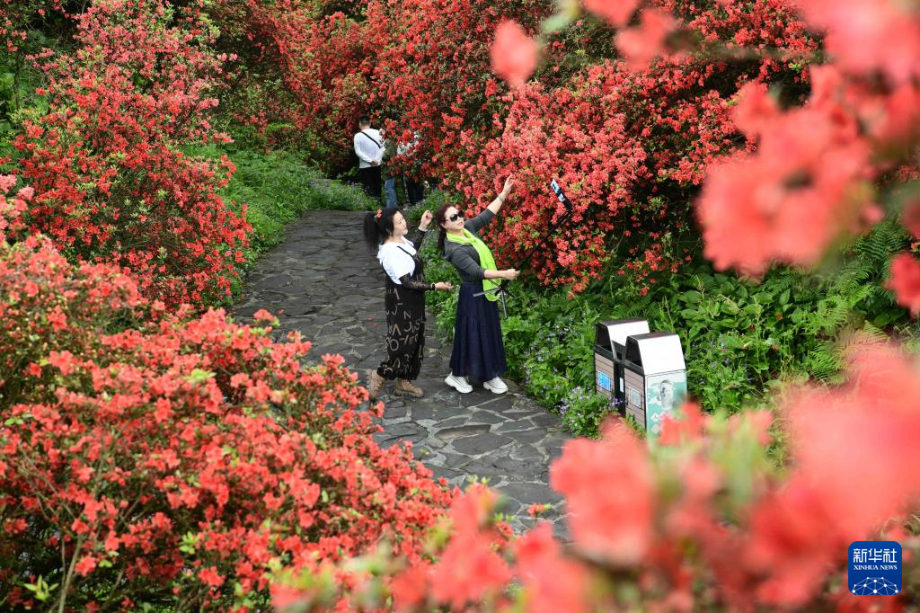 4月21日,游客在贵州省丹寨县龙泉山杜鹃花丛中游玩。新华社发(杨武魁摄)