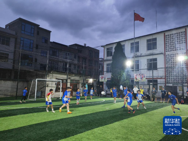 新华社贵阳5月4日(记者罗羽)“观察队友、注意配合、快速传球……”晚上七点,天气微冷,但在口寨村口寨小学的五人制足球场上,20多个小孩正在教练员王宇攀和杨俊杰的指导下轮番开展激情四射的足球训练。
