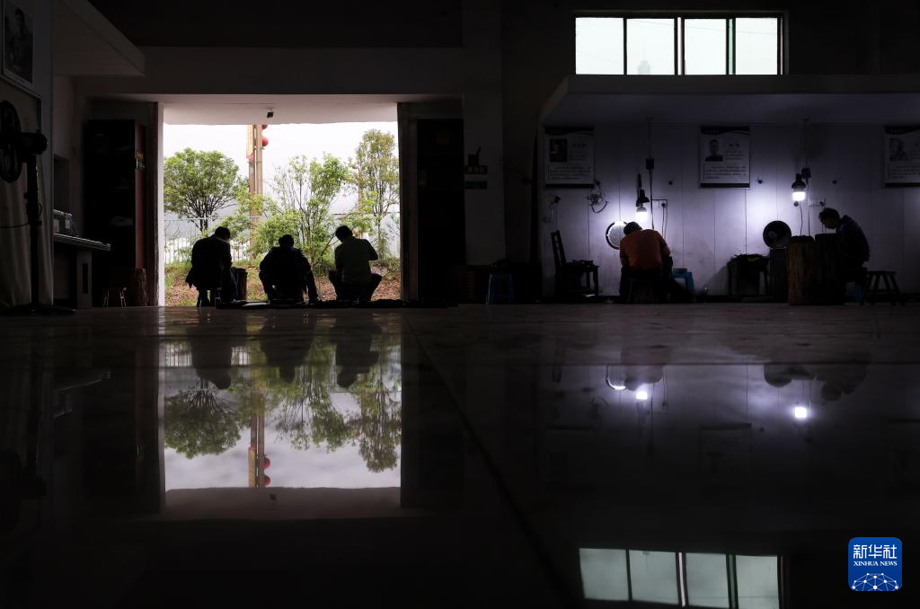 4月30日,在贵州省岑巩县思州石砚非遗传承基地,工匠在雕刻思州石砚。
