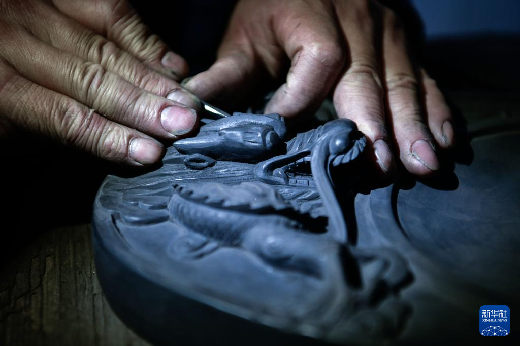 贵州省岑巩县古称思州,思州石砚是岑巩县特产,历史悠久,深受文人墨客青睐。一件思州石砚从采石、选料到制成砚台,需经历近20道复杂工序。工匠会根据每块石材的大小、纹理、造型等,设计雕刻出不同的图案。2021年,“思州石砚制作技艺”入选国家级非物质文化遗产代表性项目名录。