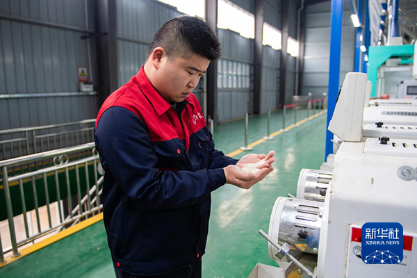2022年2月22日,在湖南省常德市鼎城区谢家铺镇亿泽生态农业科技有限公司生产车间,陈帅宇在抽查生产过程中大米的品质。新华社记者 周勉 摄