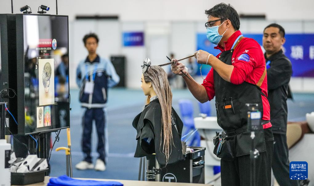 这是5月8日拍摄的第二届全国乡村振兴职业技能大赛美发项目比赛现场。新华社记者 陶亮 摄