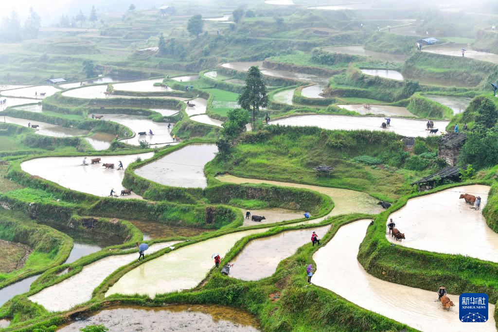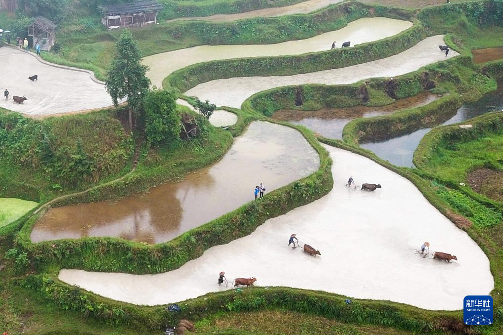 5月18日,在贵州省黎平县尚重镇洋洞村,村民在参加牛耕活动(无人机照片)。新华社发(王纯亮 摄)